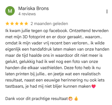 Wil je een tastbare herinnering aan een dierbare die voor altijd bij je blijft? Wij maken van jouw foto een 3D-kunstwerk dat je weer terugbrengt naar dat ene moment. Elke detail van de foto wordt laag voor laag tot leven gebracht. Tot de herinnering letterlijk voelbaar is.