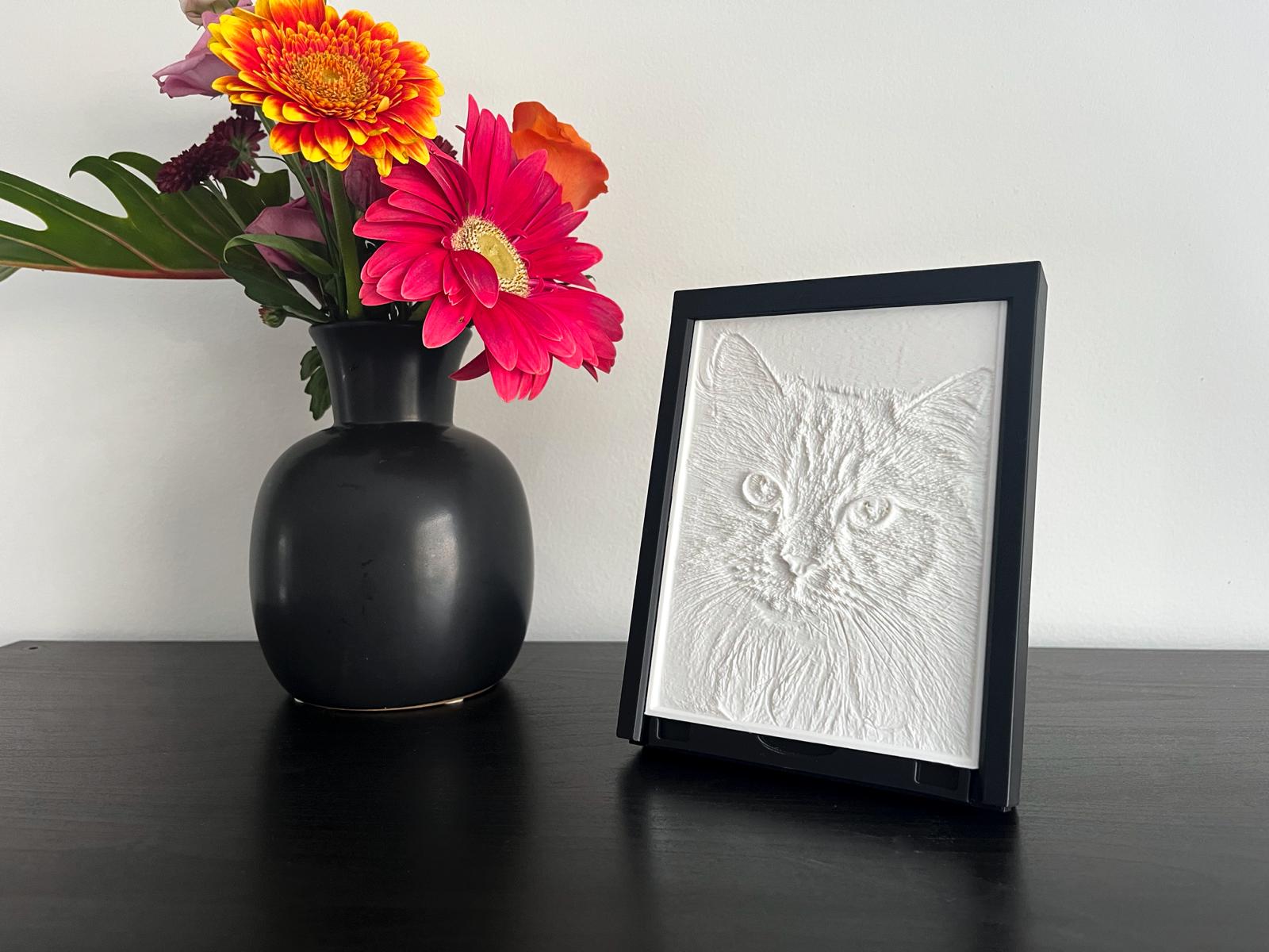 Elk kunstwerk ontwerpen we op maat en printen we met onze eigen 3D-printer. Een proces dat uren duurt. Daarna plaatsen we jouw werk met de hand in een fotolijst. Het resultaat: een persoonlijk kunstwerk dat tot leven komt.